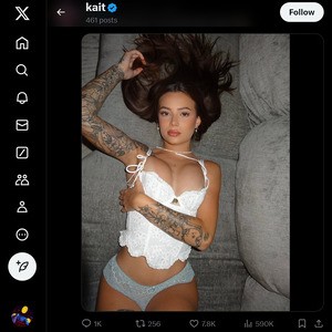 Kait’s X profile on the safe side. You get a ton of selfies, some basic-ass captions, and more pouty lips than you can handle. It's like a lot of the same shit recycled over and over. You know, nothing super wild. No dick pics, no juicy videos, just a whole lot of potential that doesn’t quite live up to the hype. You’re not getting porn-site quality here. It's free, but not everything’s on display.Don’t fucking panic, 'cause there’s a reason to hang around. The real goldmine is her OnlyFans. That’s where the party is. That is where you get custom content, dirty sexting, dick ratings, and all the fetish porn you can fucking handle. Plus, Kait’s throwing out discounts and updates like a motherfucker, and that shit is all over her X account. So yeah, her X feed might leave you with blue balls, but her OnlyFans will have you busting a load in no time.