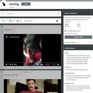 이 서브레딧은 기본적으로 남자들이 자위 영상을 올릴 수 있는 장소야. Reddit.com은 무료 웹사이트이며, 수백만 개가 넘는 서브레딧을 가지고 있으며, 그 중 많은 부분이 NSFW이야. NSFW의 의미는 'Not Safe For Work'야, 보통 서브레딧에 이 라벨이 있는 경우 포르노라고 생각하면 돼. r/jacking/은 NSFW의 서브레딧이며, 영상과 자지의 gif들로 가득 차 있어.
